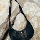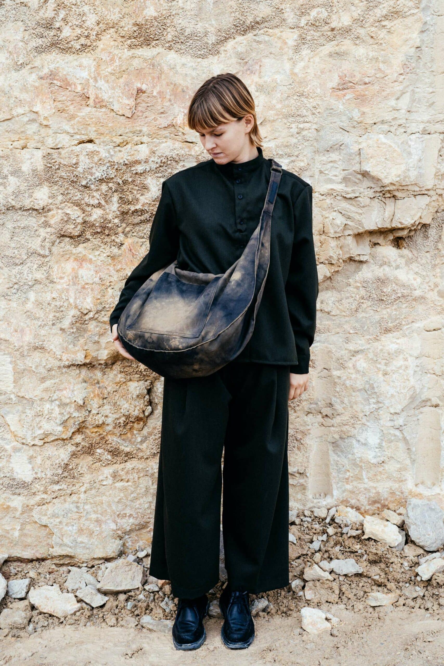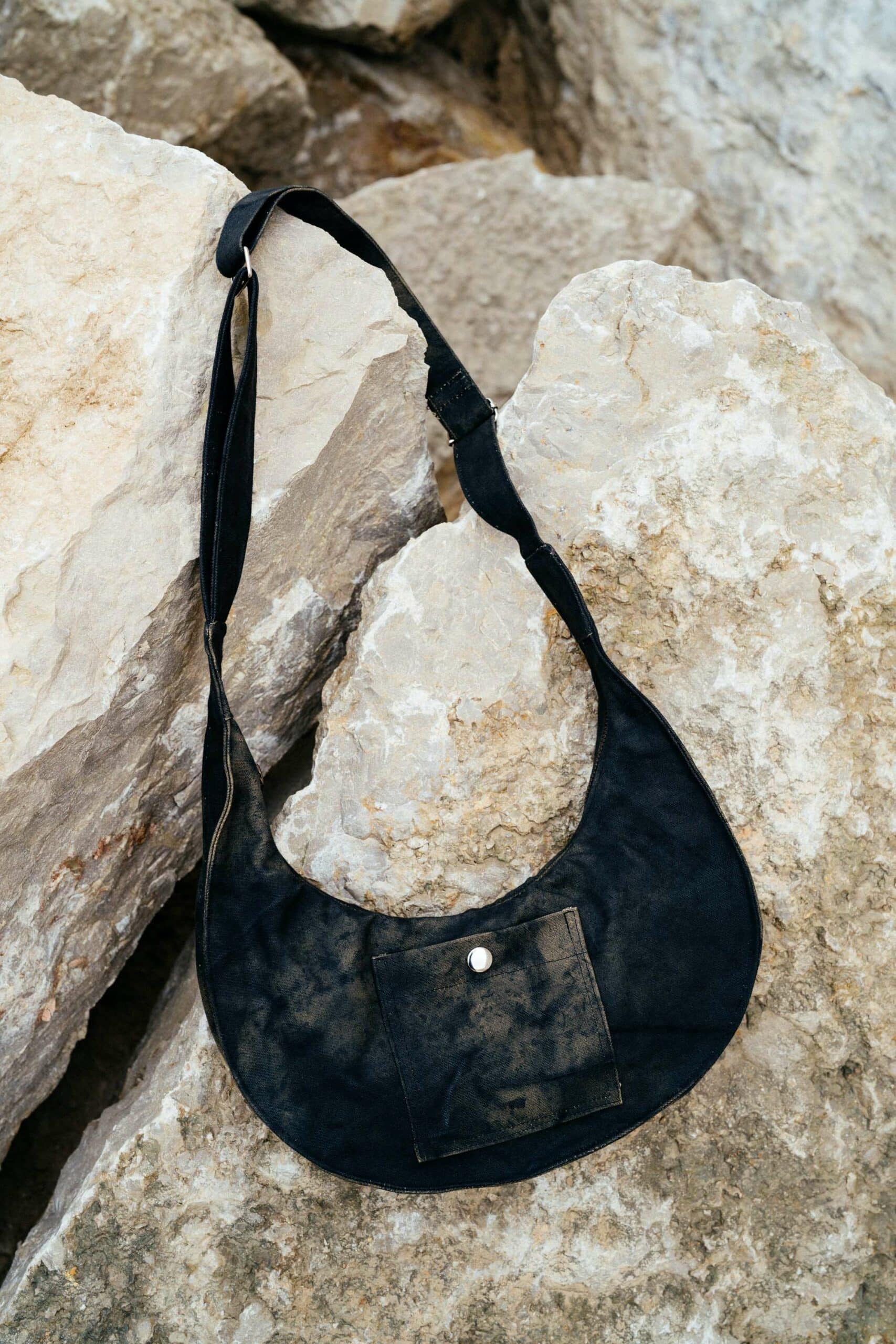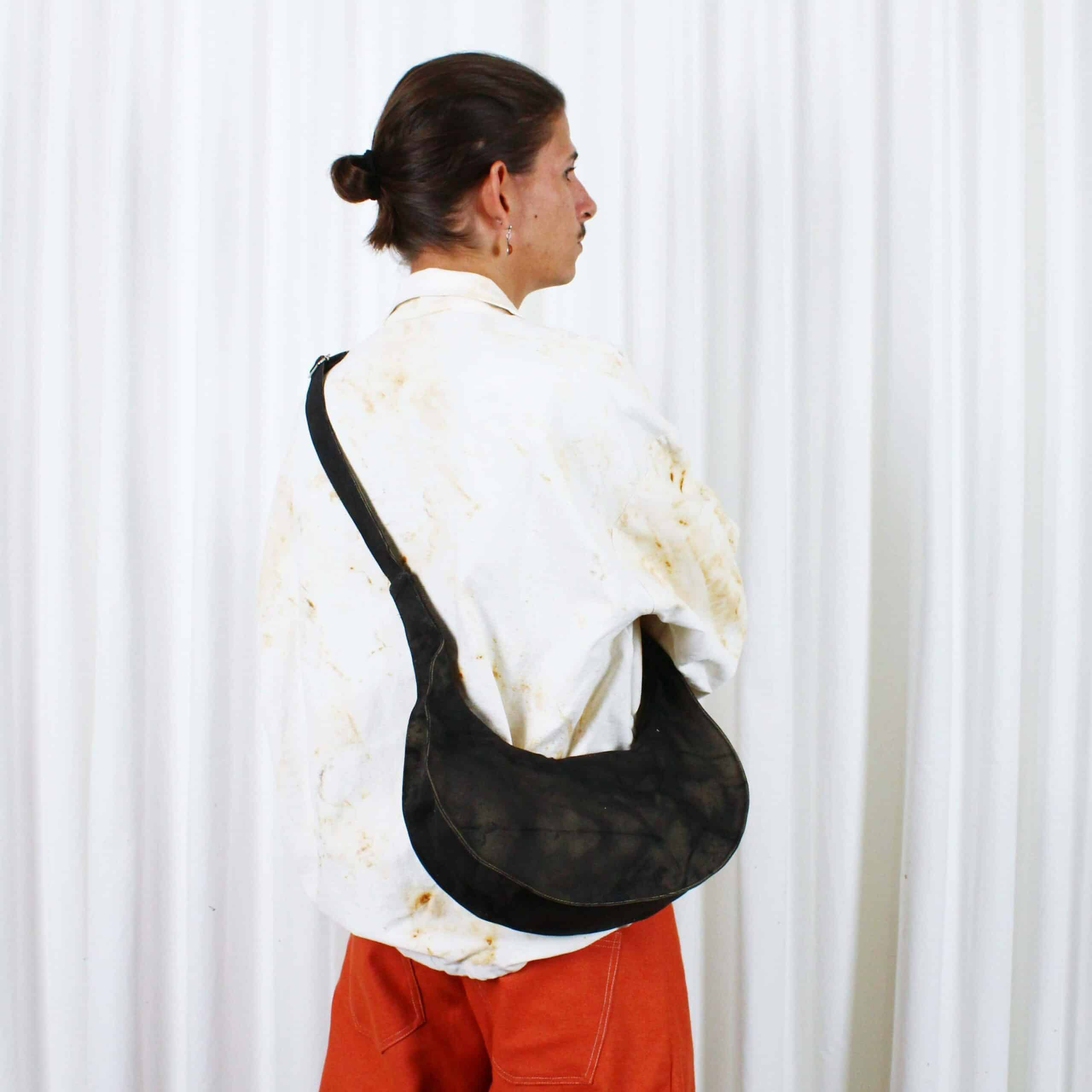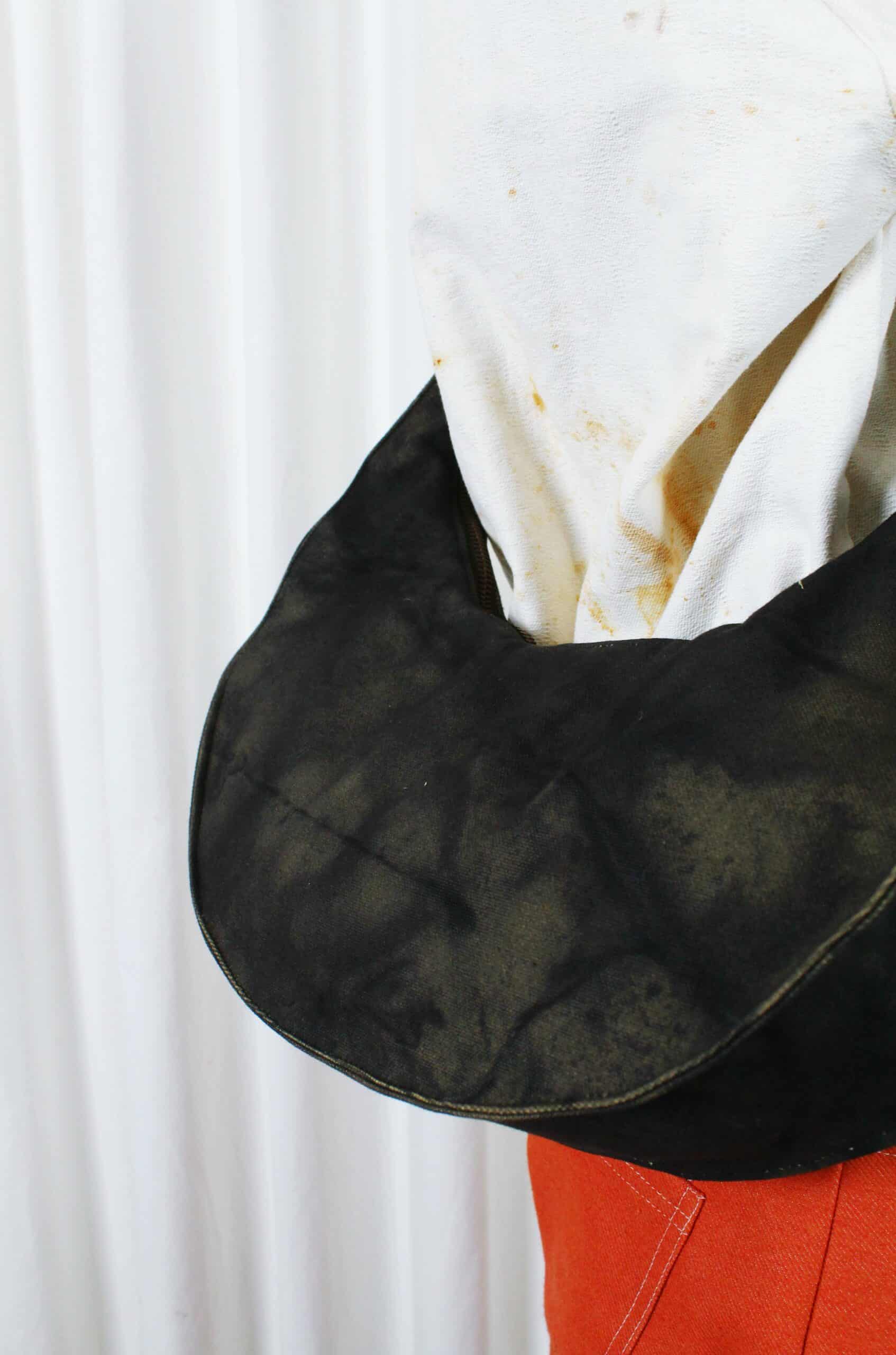 Sac rond en toile upcyclée teinte main, avec anse réglable et une poche au dos.