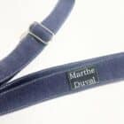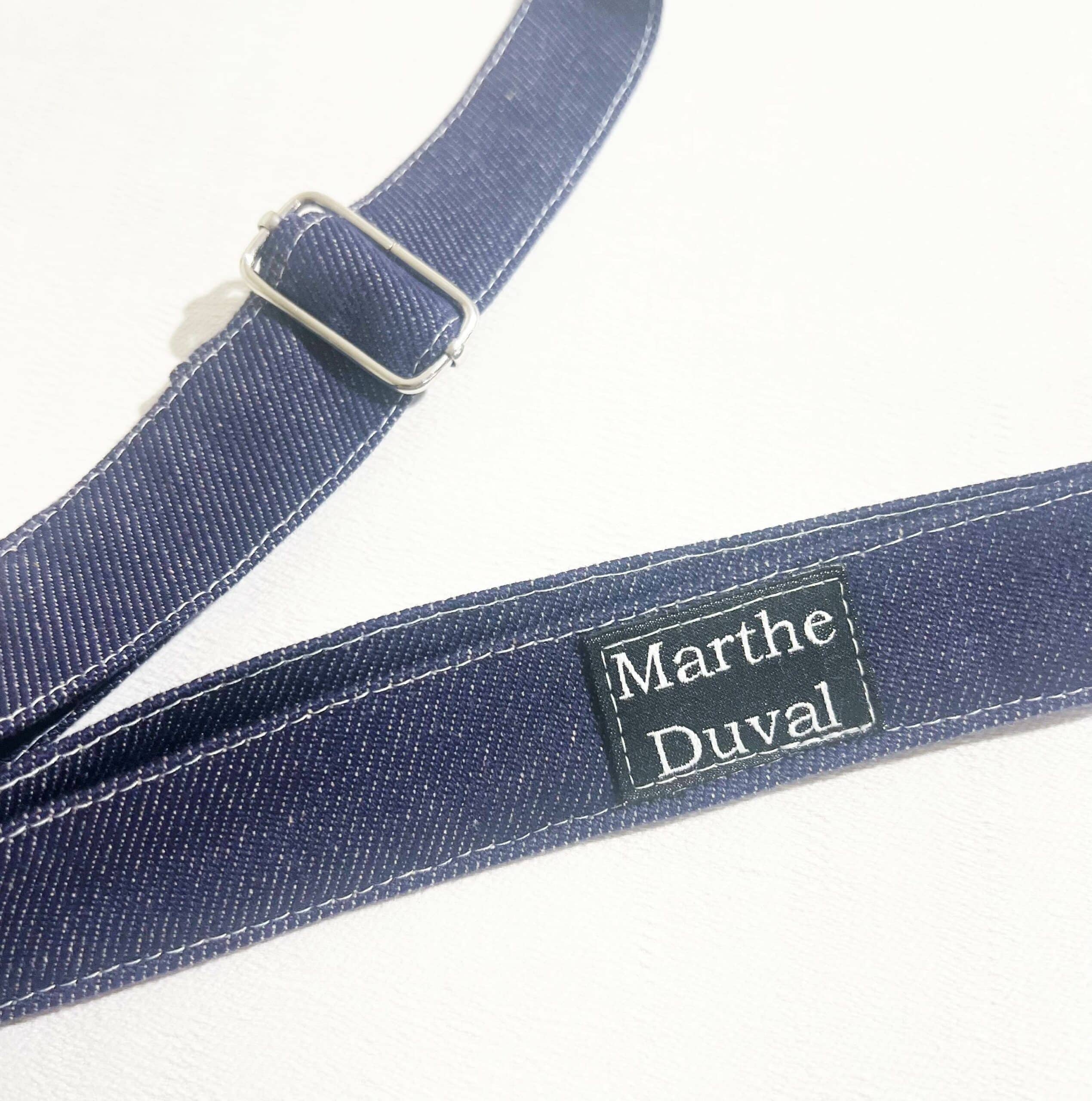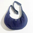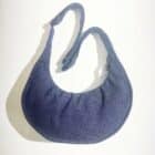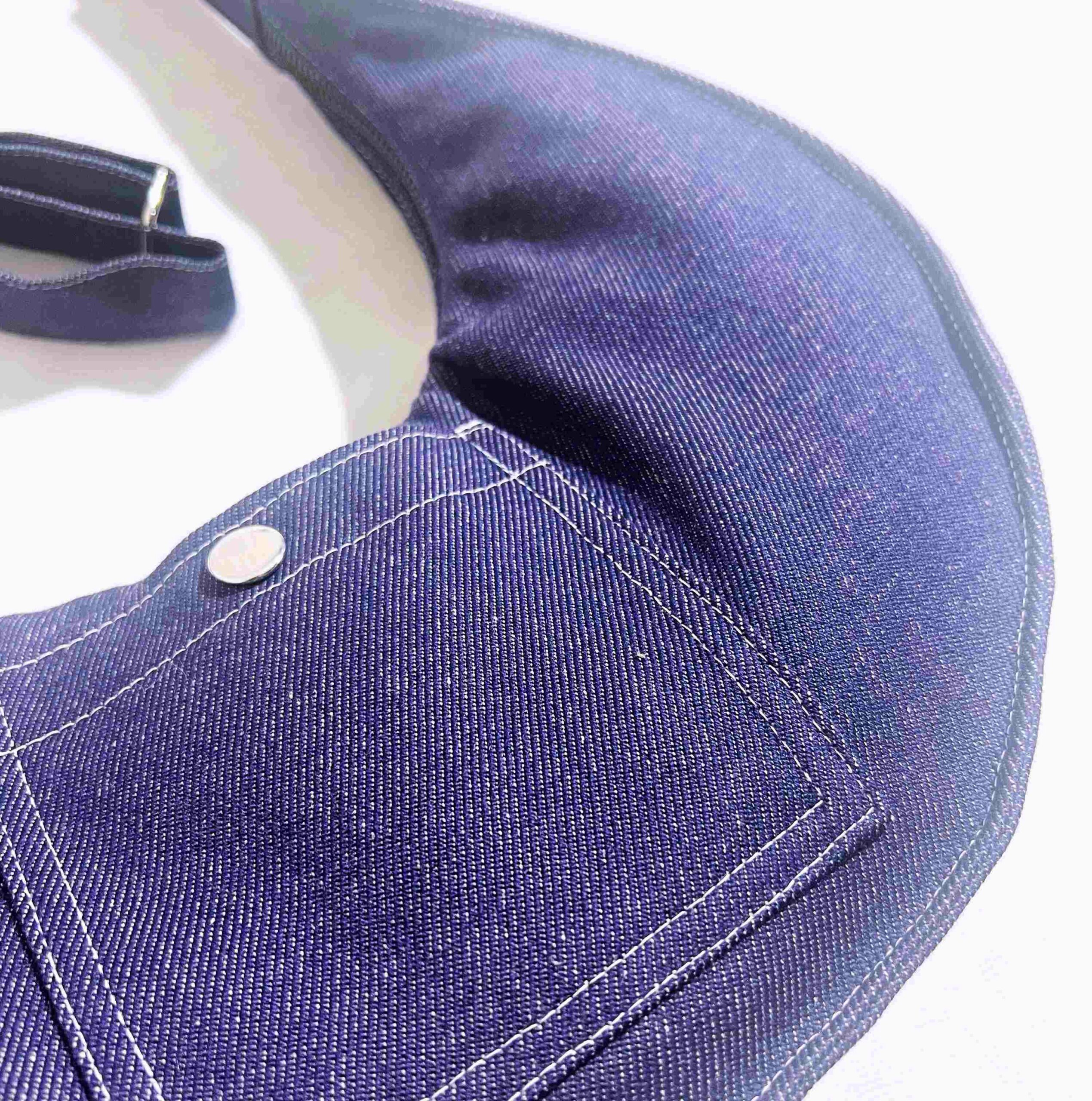 Sac rond en denim couleur indigo, avec anse réglable et une poche au dos.