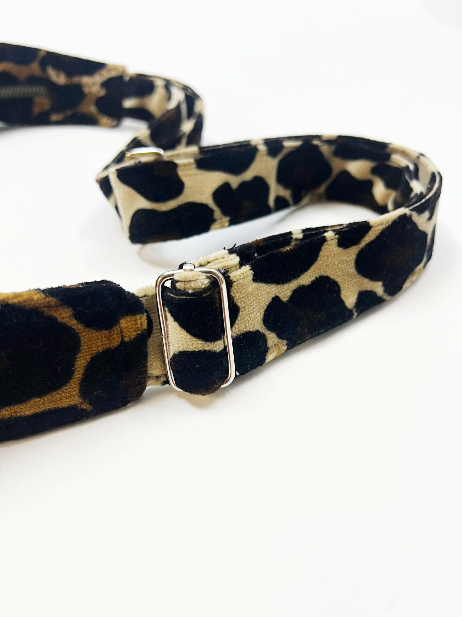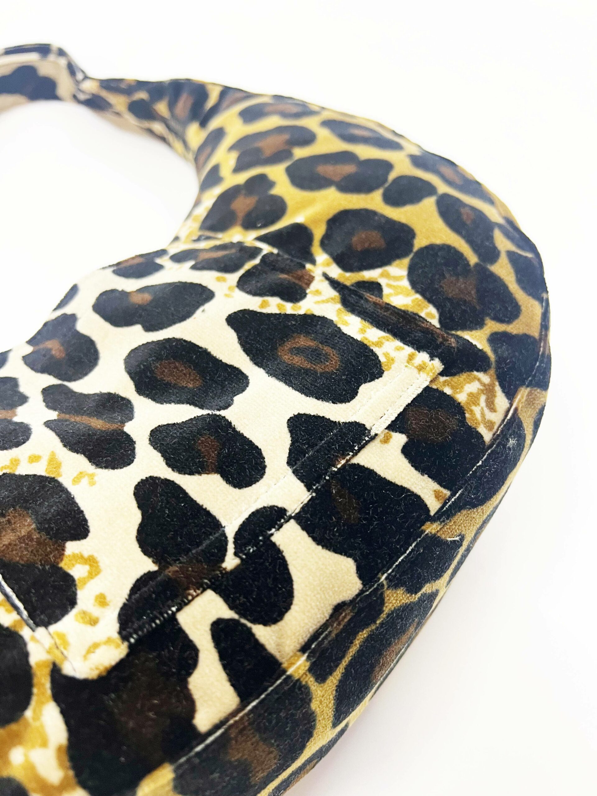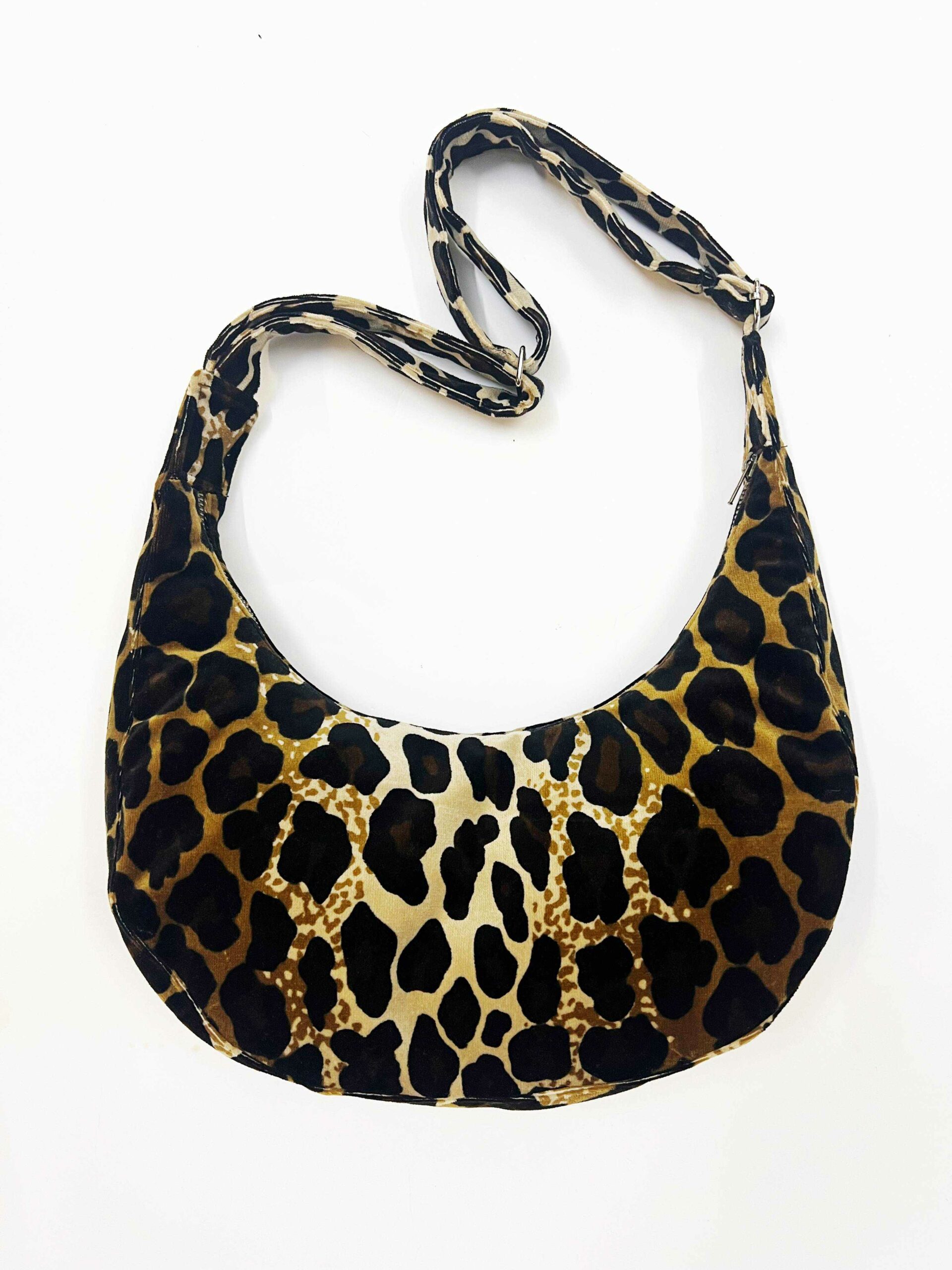 Sac rond en velours ras à motifs, avec anse réglable et une poche au dos.