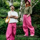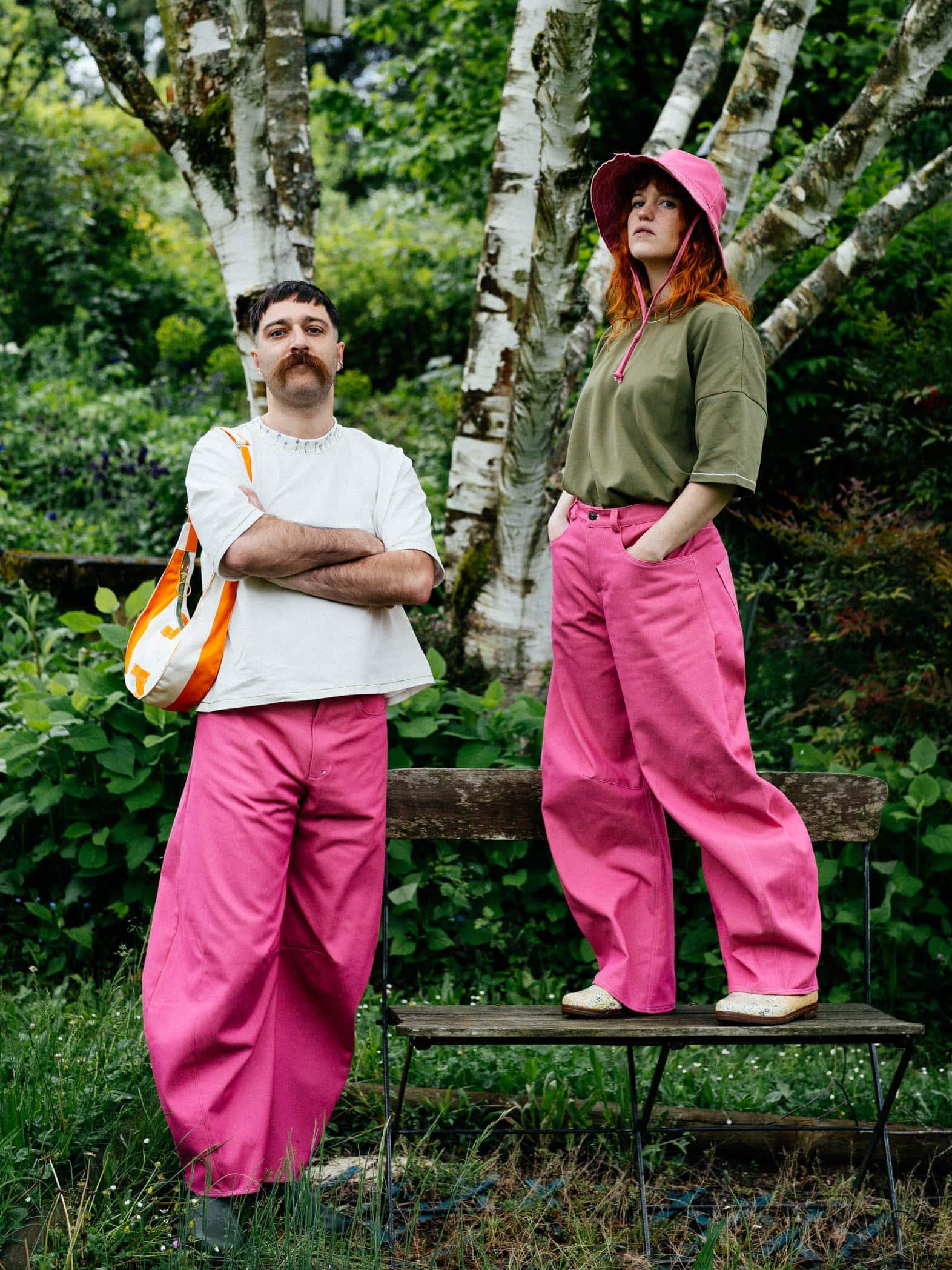 Pantalon unisexe en denim peint main, coupe oversize légèrement ballon, taille normale.