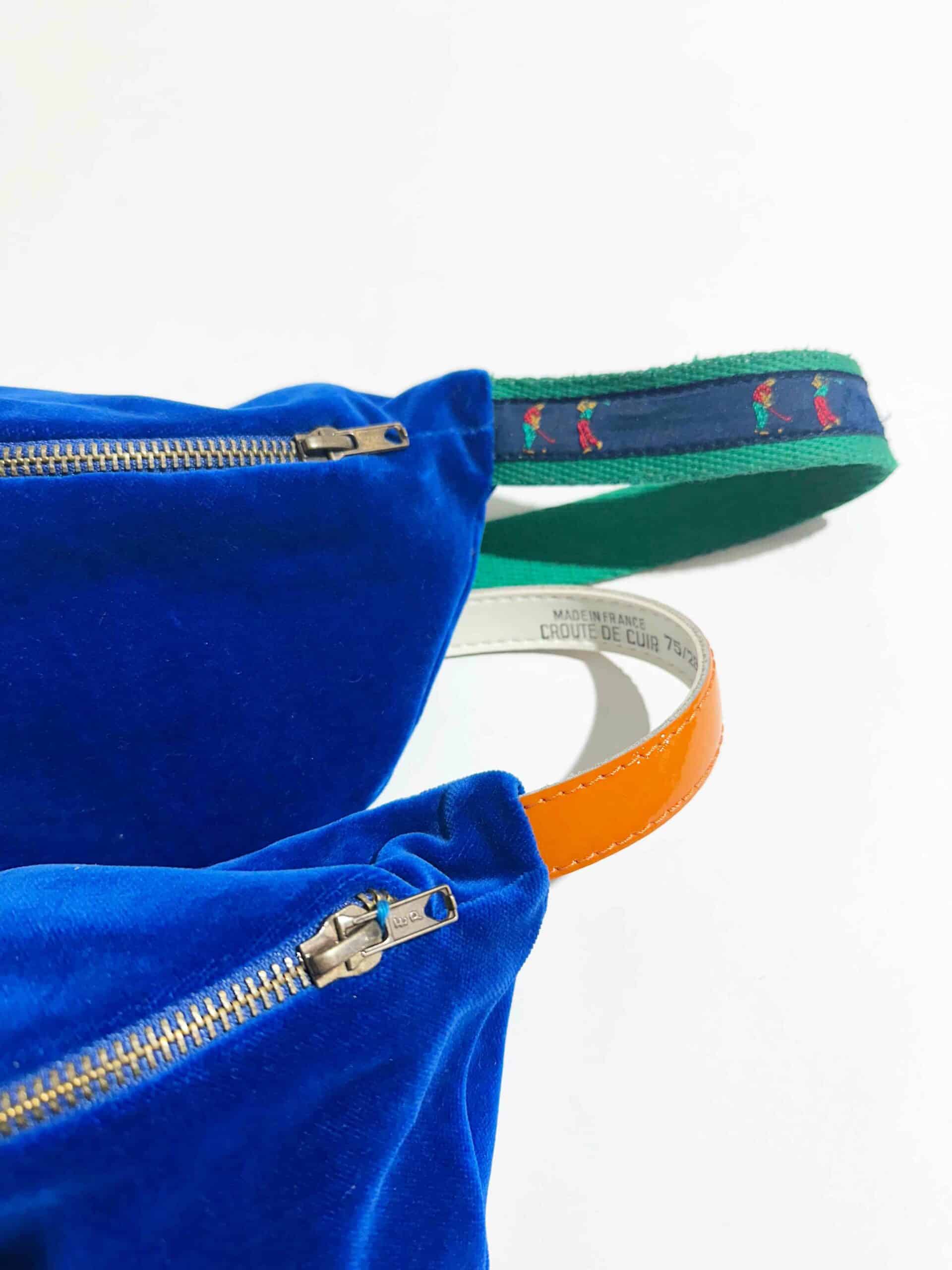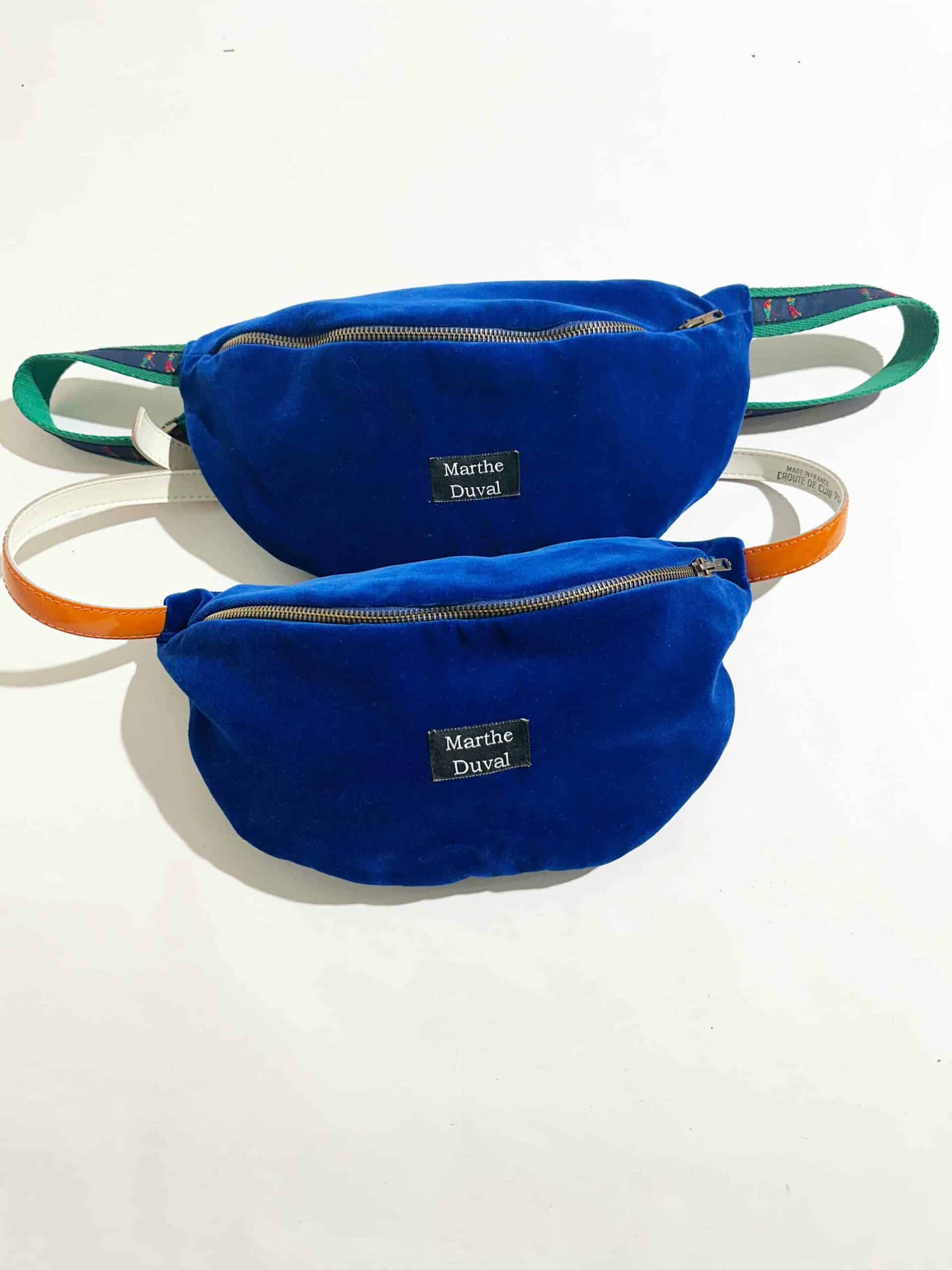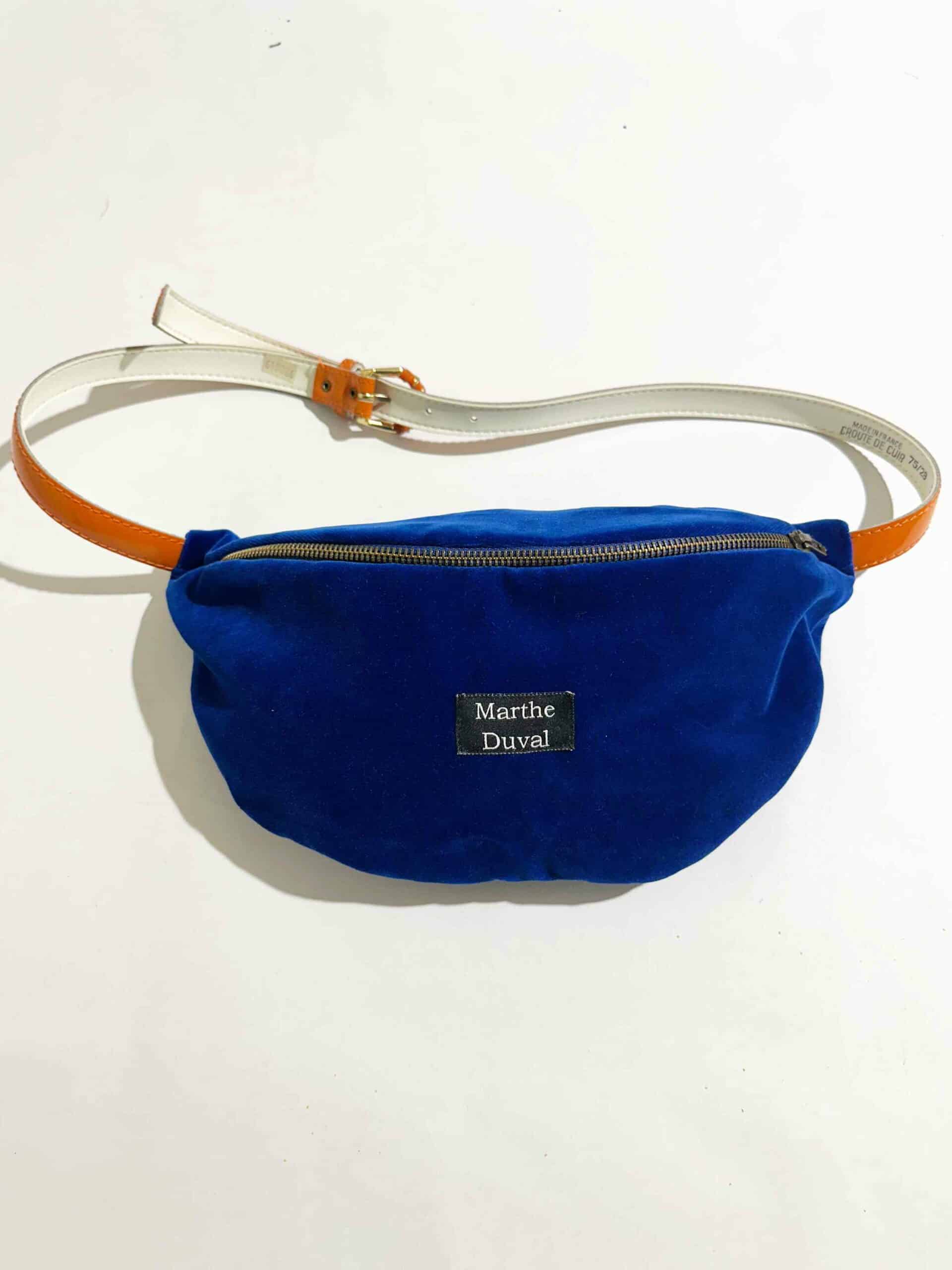 Banane XL en velours ras bleu royal, entièrement doublée et 100% surcyclée.