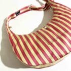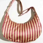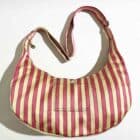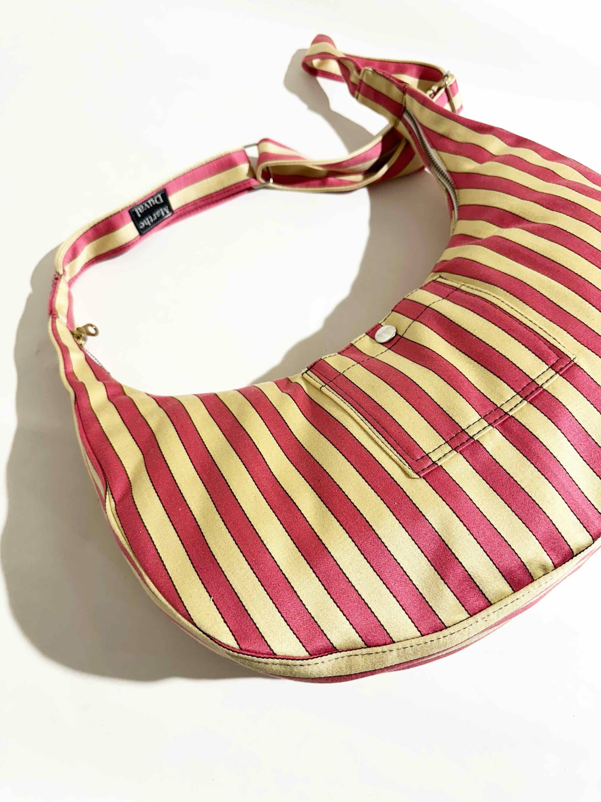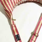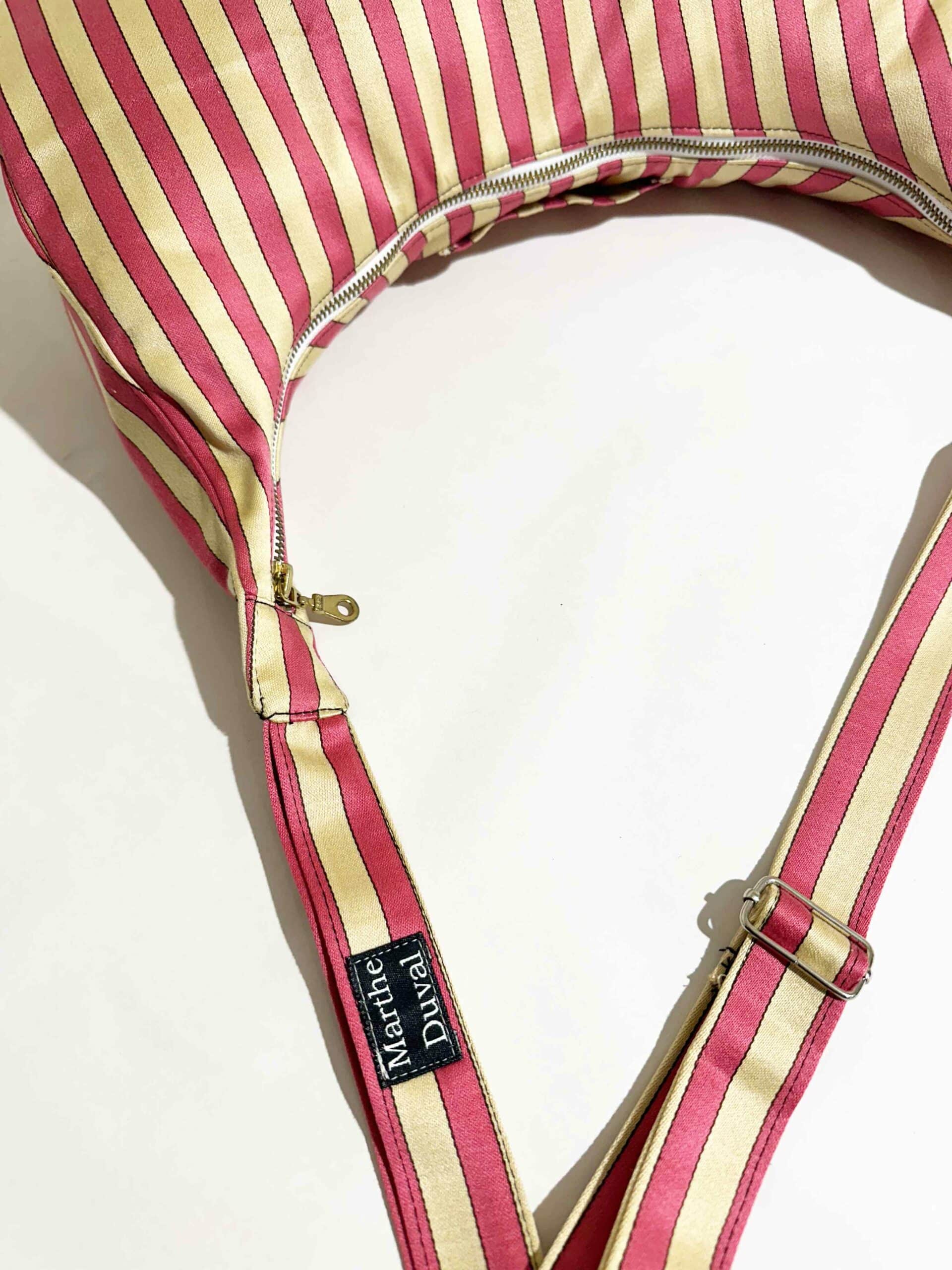 Sac rond en cotonnade rayée rose et crème, avec anse réglable et une poche au dos.