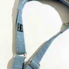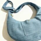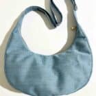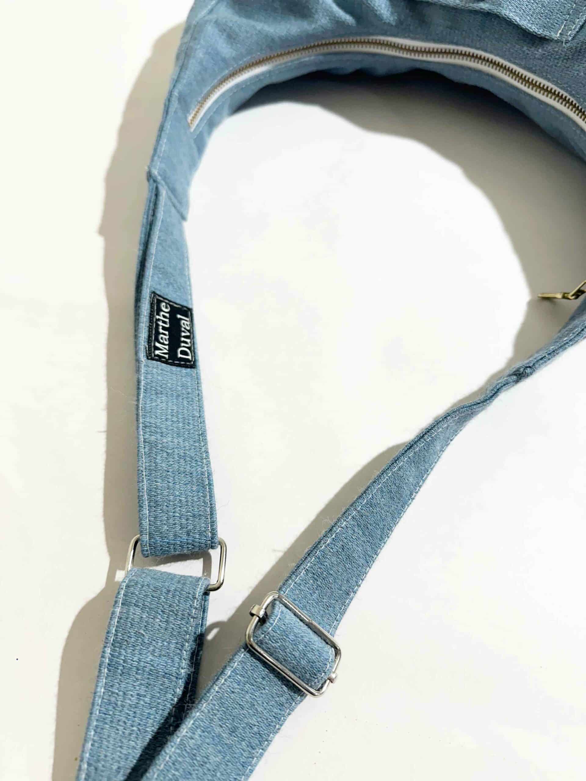 Sac rond en tissu d’ameublement, avec anse réglable et une poche au dos.