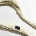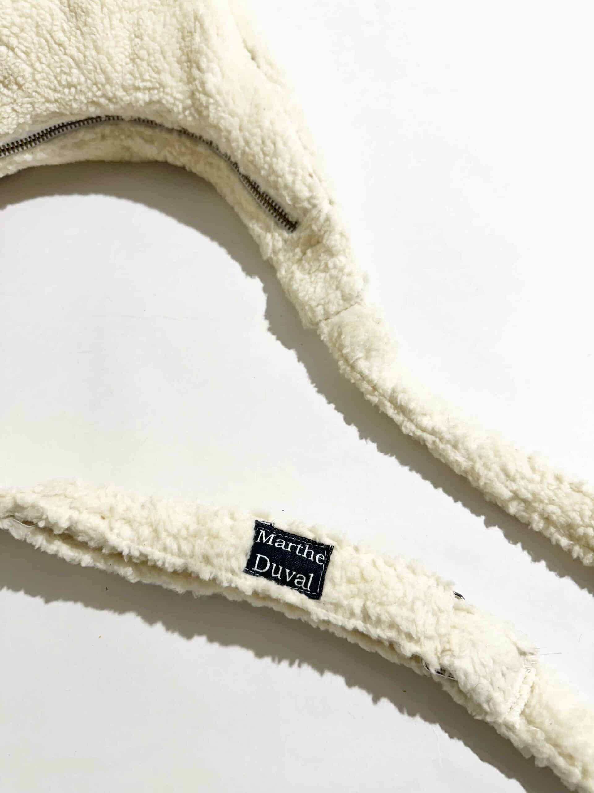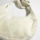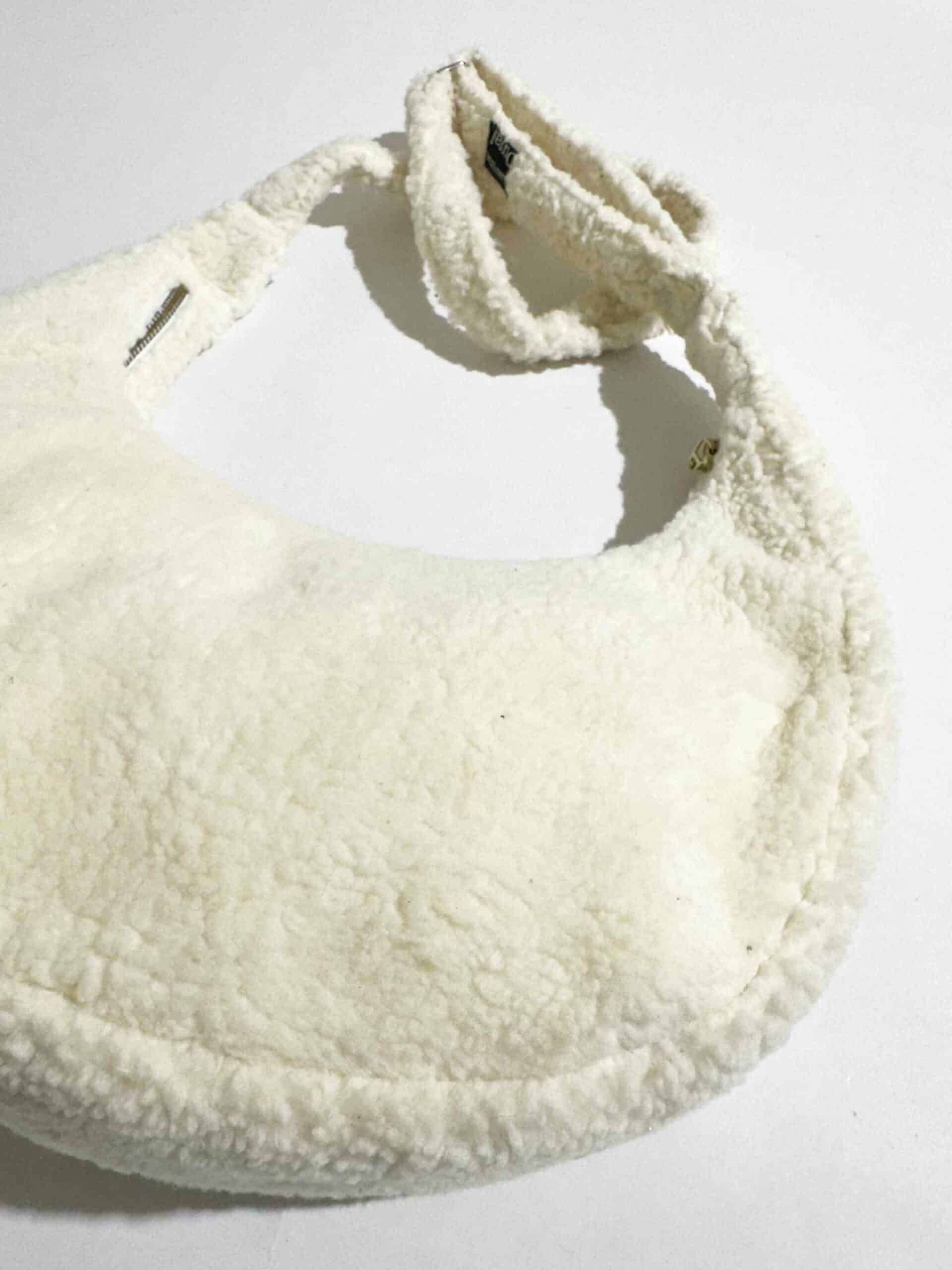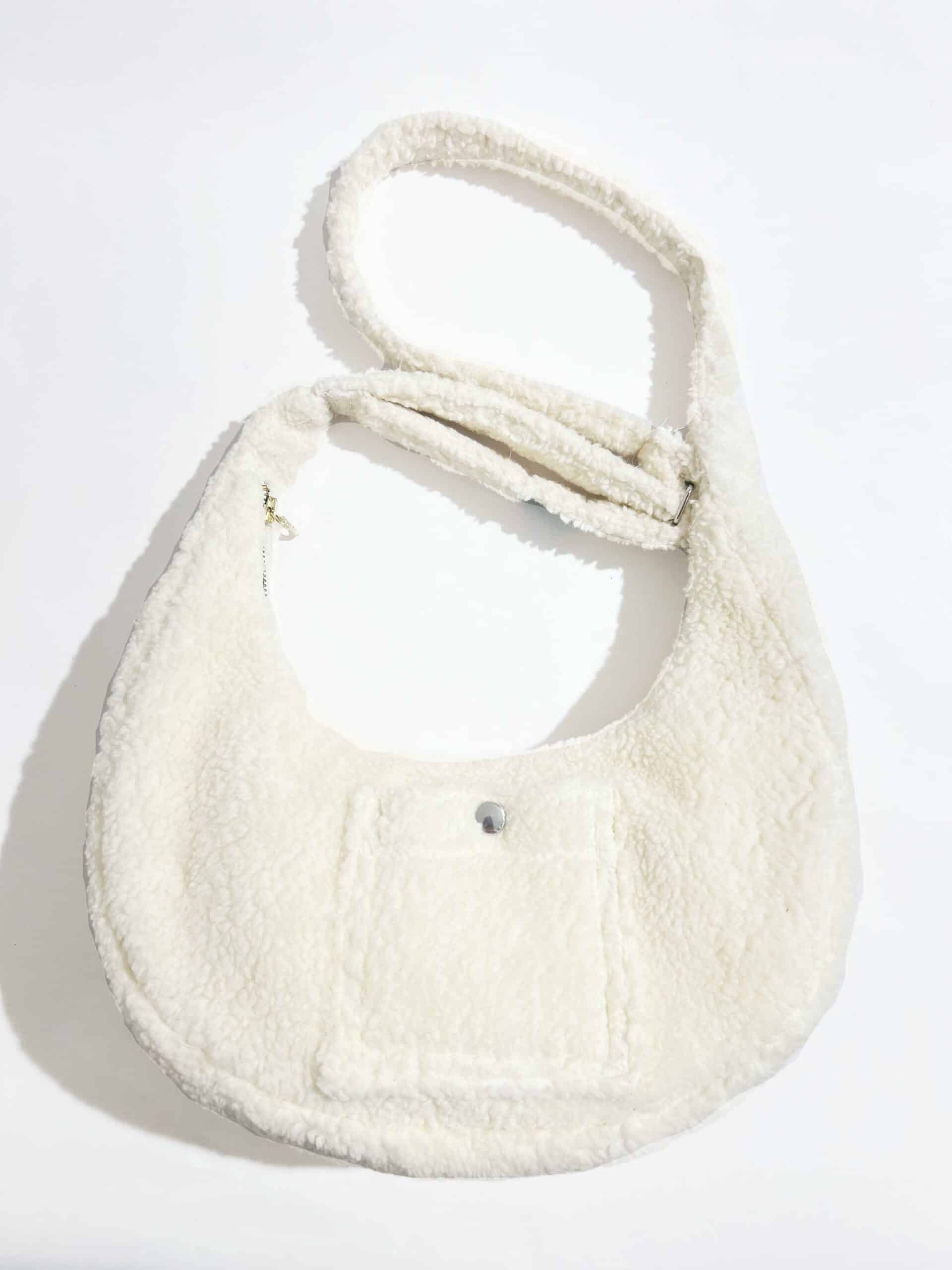 Sac rond en tissu Sherpa blanc, avec anse réglable et une poche au dos.