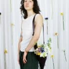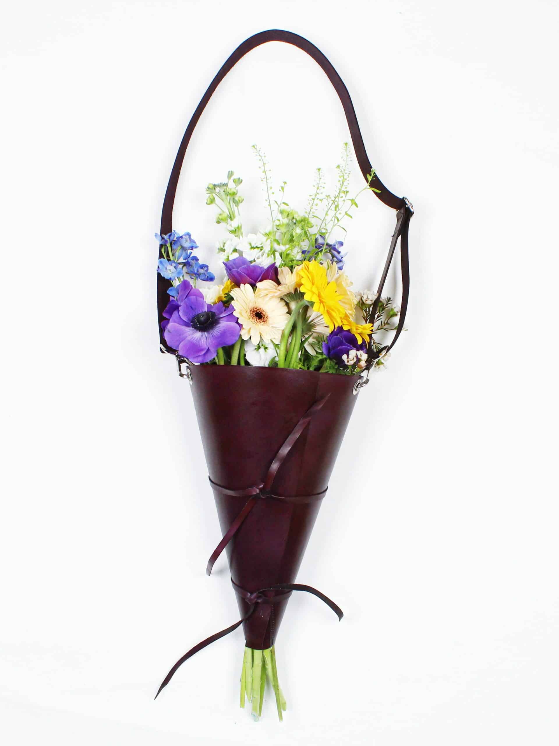 Porte-bouquet en cuir prune avec sa sangle ajustable, à porter en bandoulière ou à l’épaule.