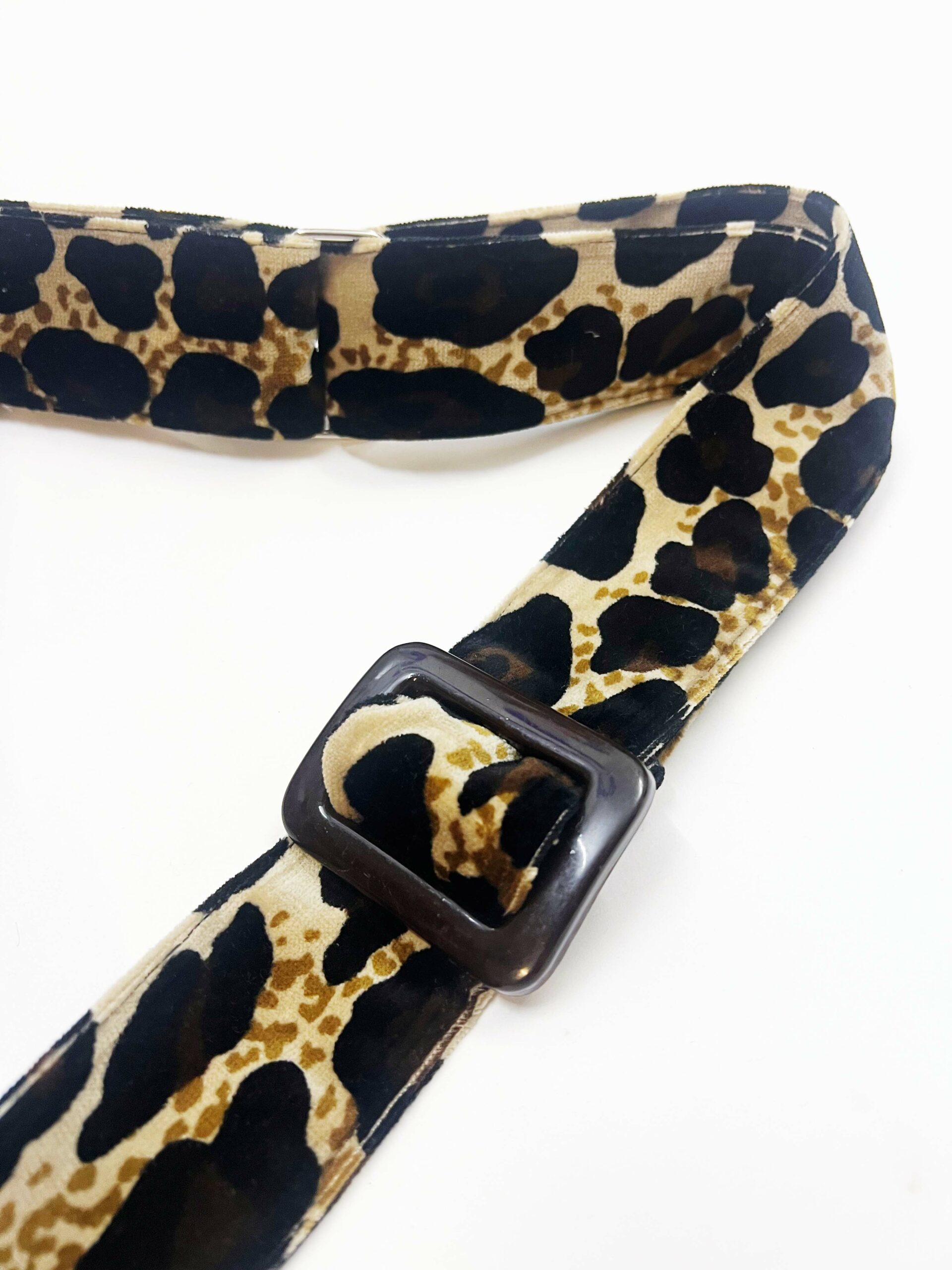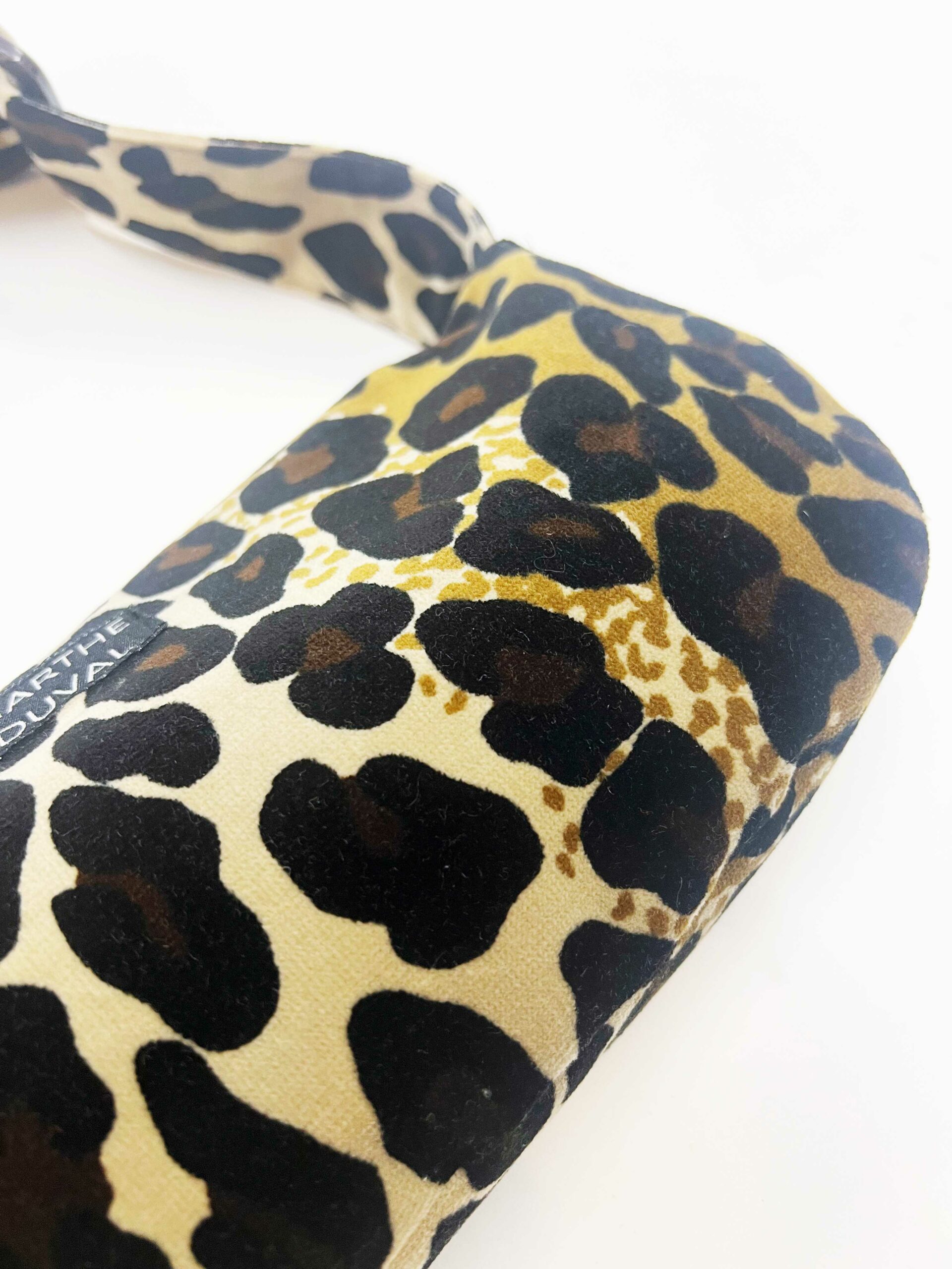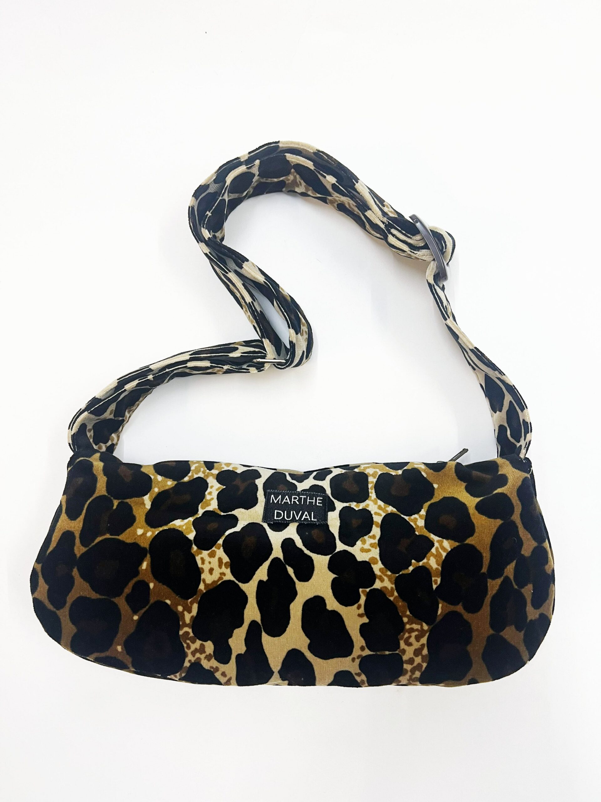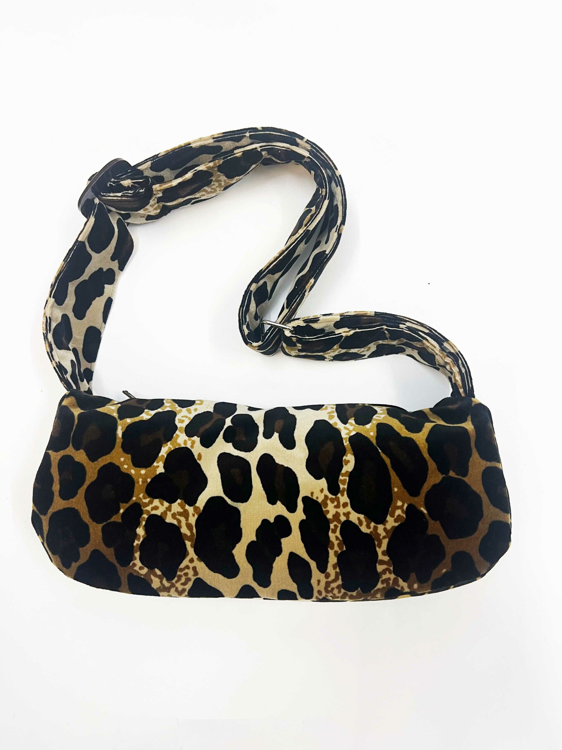 Sac baguette en velours ras à motifs, avec anse réglable et entièrement doublé.
